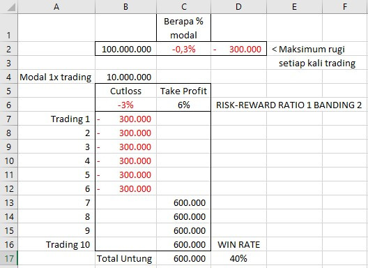 Di tabel dibawah ini saya pakai asumsi sederhana setiap kali trading cutloss -3%, dan take profitnya +6% sehingga risk-reward ratio 1 banding 2.