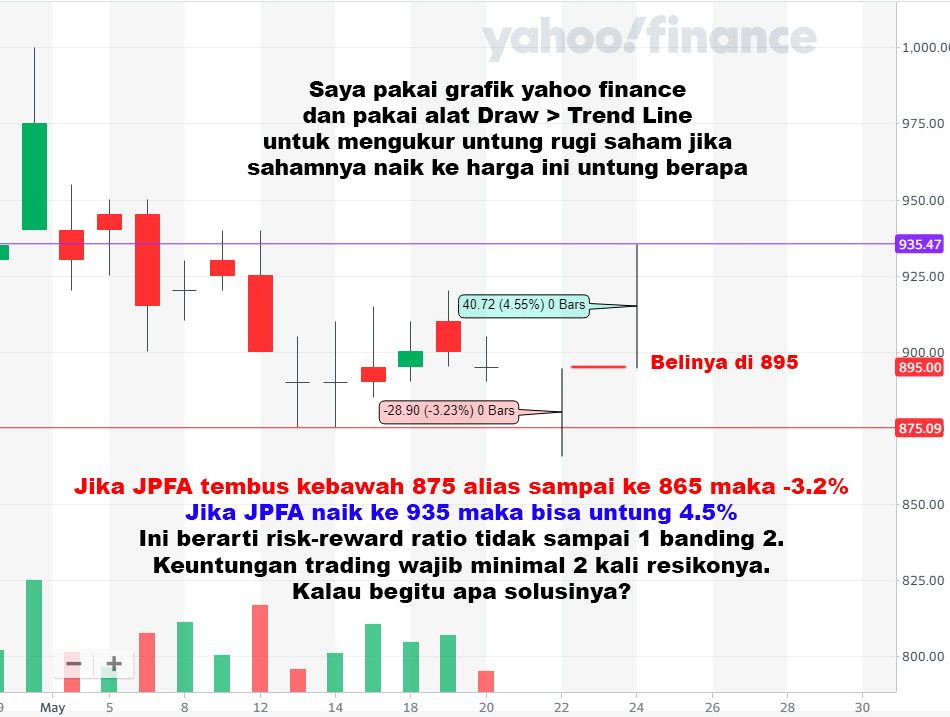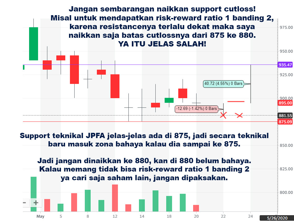 Misal JPFA supportnya di 875 trus awalnya rencana mau cutloss kalau JPFA sudah ke 860, tapi setelah dihitung ternyata risk-reward ratio tidak sampai 1 banding 2.