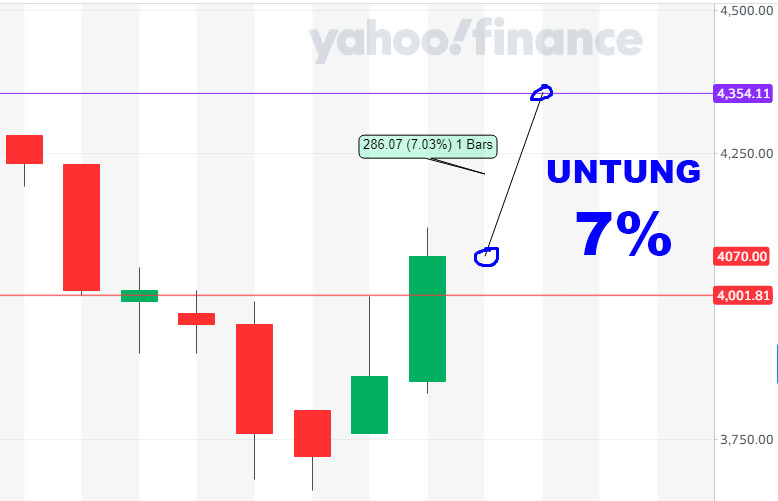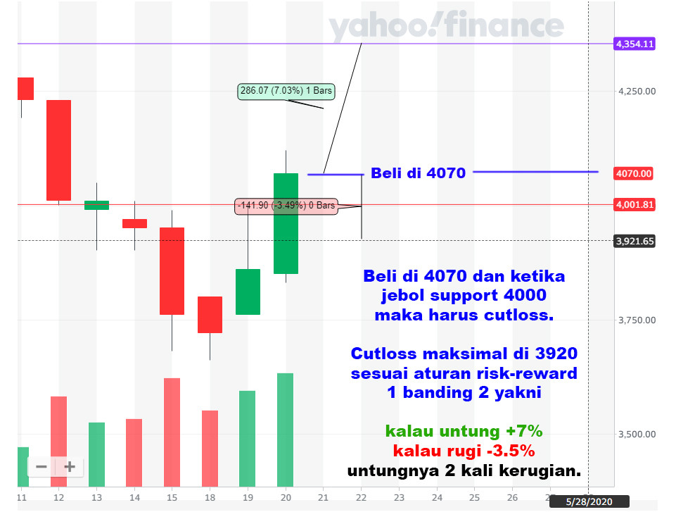 Misal rencana awal beli di 4070, take profit di 4350 +7%, dan cutloss 3920 -3.5%.