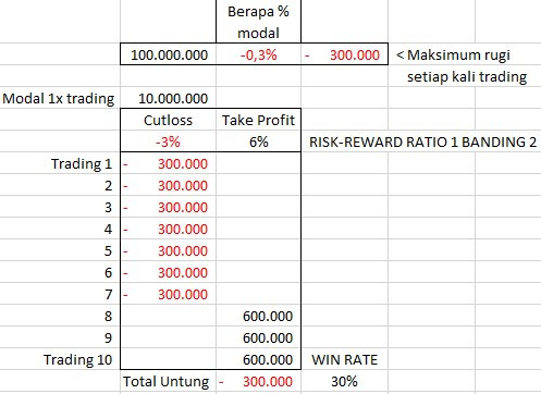 Nah selanjutnya terapkan risk-reward ratio 1 banding 2, yakni untung harus 2 kali lebih besar dari resiko.